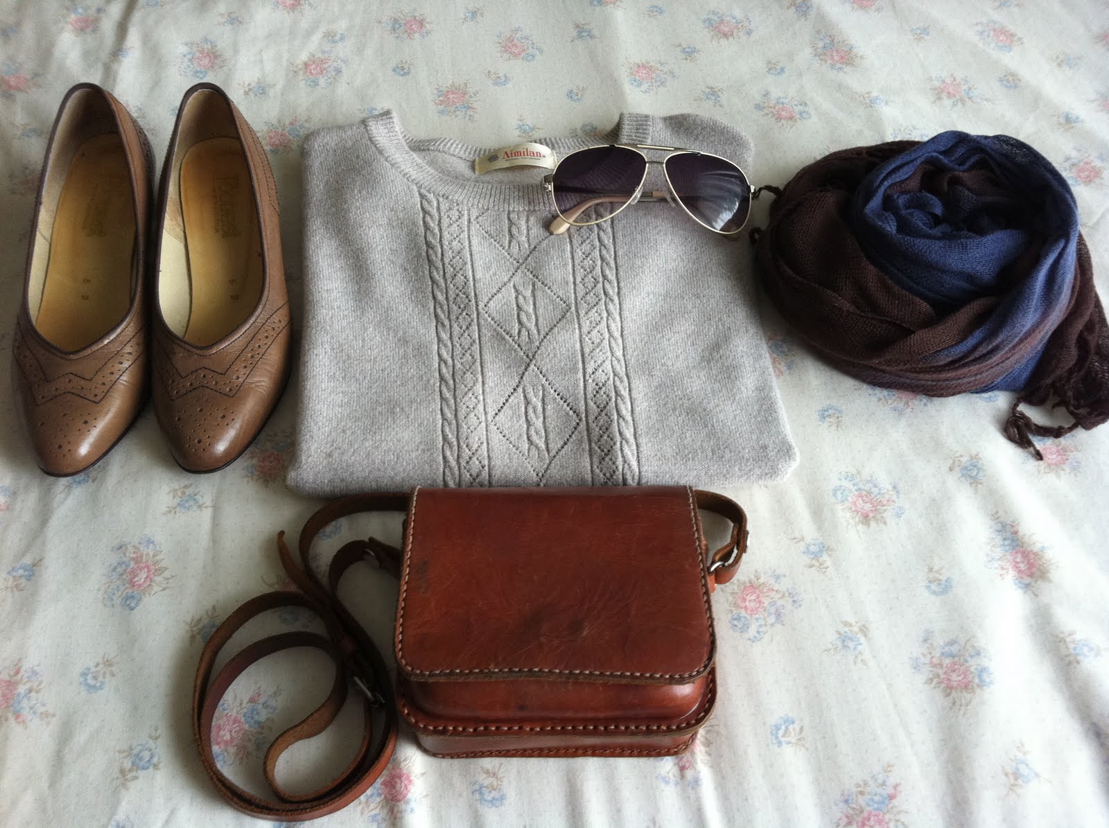 Vintage shoes, Second Hand knitted top, Scarf from Indonesia, Decjuba Sunglasses, Vintage Bag. I forgot to put my jeans in this picture. It'd be a worry if I left the house with just a top on!